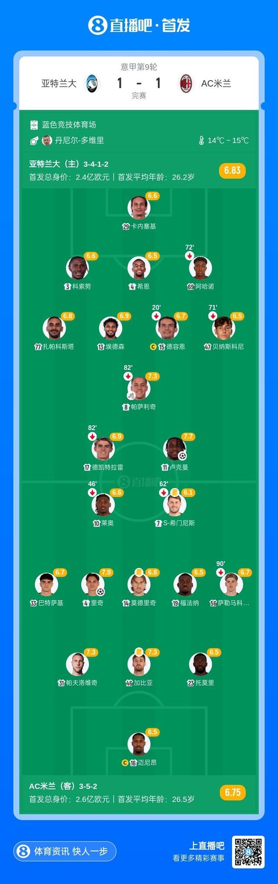 下半场补时5分钟。最终全场比赛结束,亚特兰大1-1米兰。