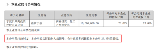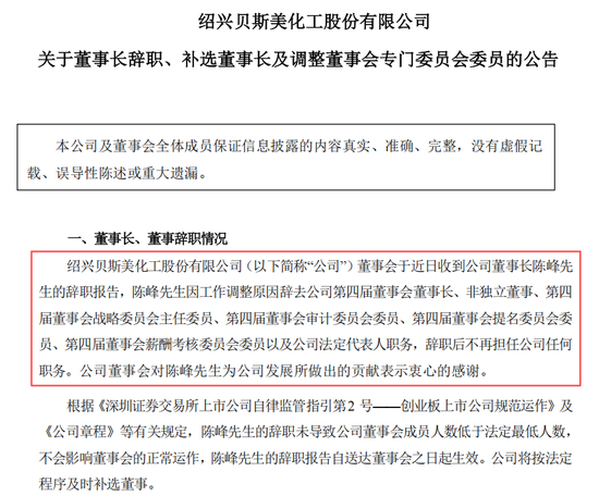今年7月21日,贝斯美公告称,公司董事长陈峰因工作调整原因,辞去公司第四届董事会董事长、非独立董事及多个董事会专门委员会职务,并不再担任公司法定代表人。辞职后,陈峰虽不再担任公司任何职务,但仍通过直接持股及一致行动人控制公司29.37%股权,保持实际控制人地位。