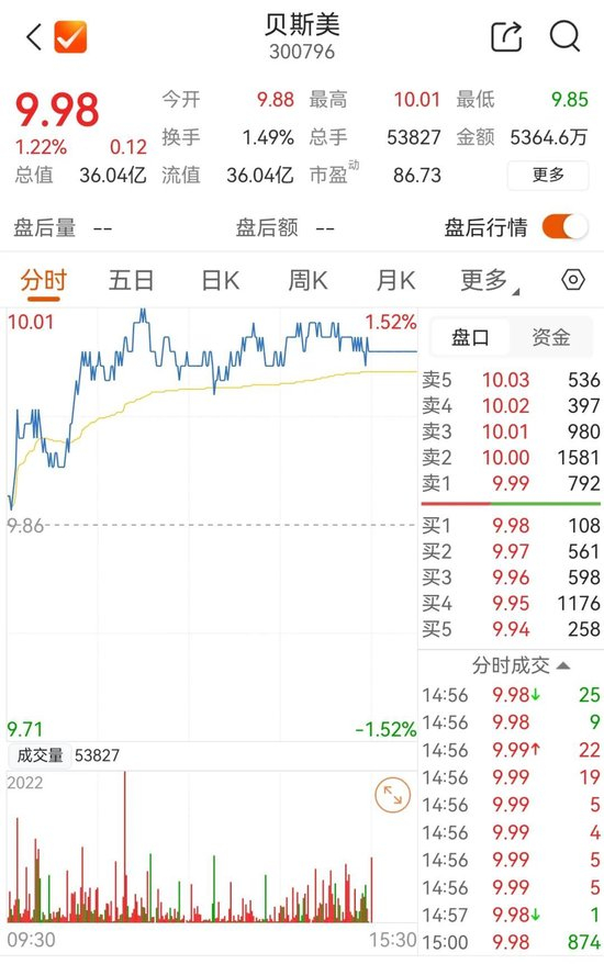截至10月31日收盘,贝斯美涨1.22%,收于9.98元/股,总市值36.04亿元。