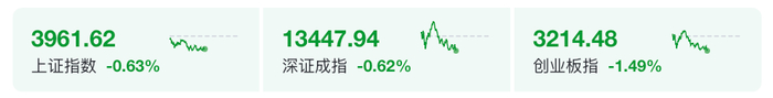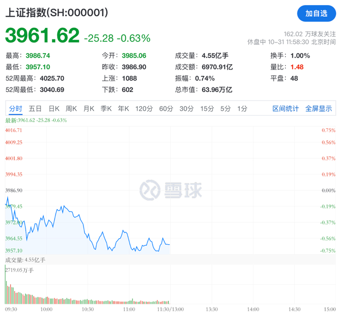 10月31日上午,A股三大股指集体低开,盘初震荡拉升后低走。截至午间收盘,沪指报3961.62点,跌0.63%,深证成指跌0.62%,创业板指跌1.49%。