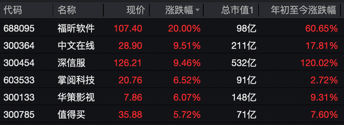 福昕软件、福石控股录得20cm涨停,视觉中国录得10cm涨停。中文在线、深信服涨超9%,焦点科技、易点天下等跟涨。