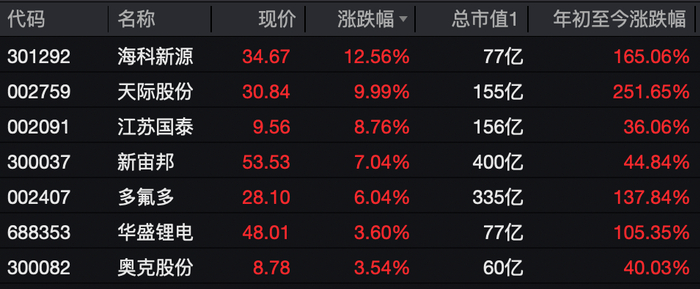 锂电电解液概念大涨5.4%。个股方面,截至午间收盘,天际股份录得一字涨停,海科新源一度封板,现涨12.56%,多氟多盘中触及10cm涨停,现涨6.04%。