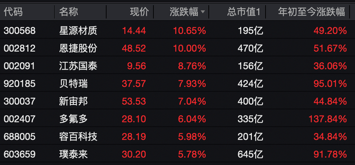 今天上午,新能源板块普涨,固态电池板块上涨,锂电电解液、锂电正极、锂电负极、磷酸铁锂电池概念板块走高。