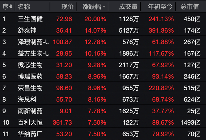 个股方面,三生国健大涨20%,舒泰神、易方生物等涨超10%。