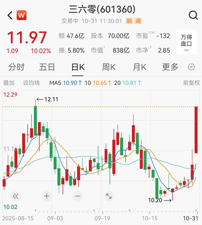 三六零录得10cm涨停,现报11.97元/股,最新市值为838亿元。
