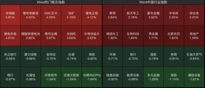 从板块看,新能源板块集体爆发,电池板块多日上涨,锂电电解液概念股延续强势。AI应用概念股活跃,创新药板块强势反弹;而科技板块集体回调,CPO概念股大跌,存储芯片概念股震荡走弱,培育钻石、稀土、保险出现回调。