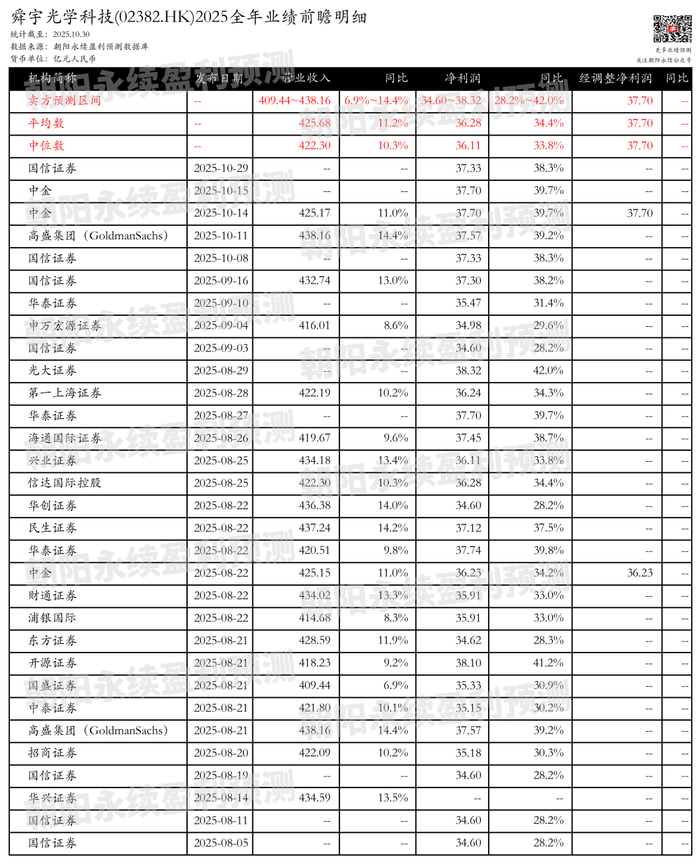 截至2025年10月30日,根据朝阳永续季度业绩前瞻数据: