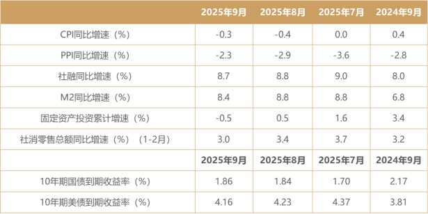 本月公布了2025年1-9月的金融、通胀和经济数据。整体上看,前三季度面临外部经贸环境波动带来的冲击,代表新质生产力发展的高技术制造业等领域保持较快增速。三季度GDP同比增速回落至4.8%,主要是在出口增速加快的同时,国内投资、消费减速,内需对经济增长的拉动力减弱。其中,1-9月固定资产投资同比为-0.5%,出现历史罕见的负值,增速较上半年回落3.3个百分点,是当季GDP增速下行的主要原因。金融方面,9月新增人民币贷款12900亿,同比少增3000亿;9月新增社会融资规模为35338亿,同比少增2297亿。总体上看,9月贷款季节性大幅投放,但同比延续少增。这一方面源于经济结构转型升级,经济增长对贷款投放的需求有所下降,同时也与当前居民消费需求不旺,房地产市场持续处于调整状态,外部波动下企业投资需求受到抑制,以及隐债置换等有关。通胀方面,9月CPI同比下降0.3%,上月为下降0.4%;9月PPI同比下降2.3%,上月为下降2.9%。消费方面,9月社零增速放缓,一是第三批以旧换新资金受剩余额度限制,补贴领取难度加大,加之上年同期以旧换新政策实施推升基数,9月家电、家具、文化办公用品等补贴范围内商品销售增速明显下行;二是今年中秋节落在10月,对当月消费带来不利影响。同时,近期整治违约吃喝导致餐饮销售增速低位运行。