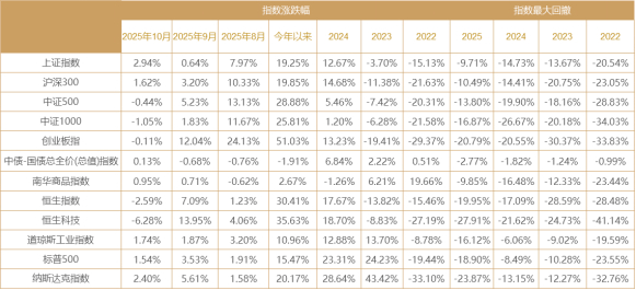 10月份(截止2025年10月24日),主要指数表现为跌多涨少。具体来看,上证50和上证综指领涨,本月涨幅分别为1.90%和1.74%;恒生科技和宁组合下跌,跌幅分别为6.28%和6.69%。