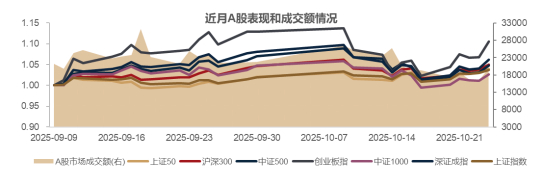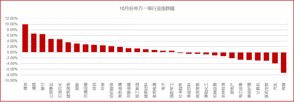 10月三地市场表现震荡,市场在经历地缘政治扰动引发的回调后反弹。海外资产震荡创新高。特朗普贸易立场的暂时缓和,美股市场延续反弹,三大宽基指数涨幅在2%-4%。由于美国经济基本面存在一些压力,叠加贸易政策的不确定性,且美股估值处于较高区间,仍需警惕美股的后续波动。中国资产方面,国庆之后,市场本身已积累一定调整需求;另一方面中美贸易摩擦升级背景下,月初权益市场震荡回落。而后中美元首会晤确定举行与四中全会带来的政策预期,共同推动市场风险偏好回升,全月风格出现切换,大市值风格表现由于小市值方向。沪深300上涨1.56%,中证1000下跌0.25%,恒生指数下跌0.71%。