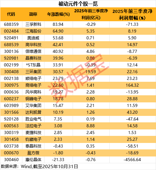 进一步来看,这20余只个股中,年内跑输被动元件指数涨幅(20.98%),且今年前三季度净利润增幅超过10%的个股仅有5只,分别是铜峰电子、艾华集团、达利凯普、法拉电子、钧崴电子,后2只个股年内涨幅均低于5%。