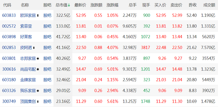 4、皮阿诺(002853):总市值41.16亿元,定位中高端定制家居,尤其在工程渠道与橱柜领域具备一定优势,当日股价涨幅居前;