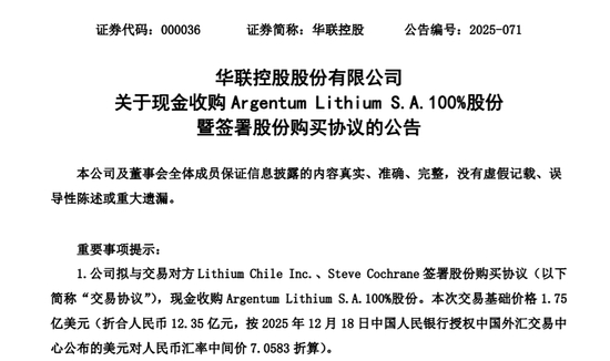 华联控股12月22日晚公告,公司拟以自有或自筹资金约1.75亿美元(折合人民币12.35亿元)受让Lithium Chile Inc.(简称“智利锂业”)和Steve Cochrane合计持有的Argentum Lithium S.A.(简称“Argentum”)100%股份,从而获得Arizaro项目80%的权益。同日,公司与交易对方签署了《股份购买协议》。
