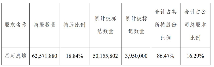 截至11月11日,星河息壤持有威龙股份18.84%的股份,其中累计被冻结和标记的股份合计占其持股的86.47%,占公司总股本的16.29%。