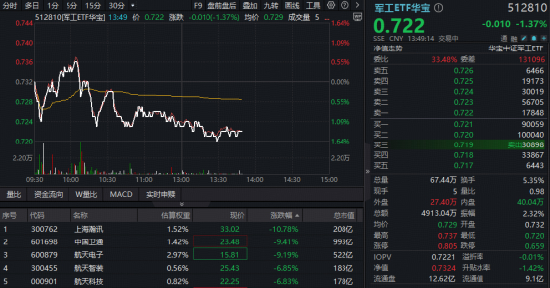 ETF方面,高人气军工ETF华宝(512810)被动跟踪中证军工指数,午后一度跌至1.64%,止步四连阳,实时成交超4900万元。