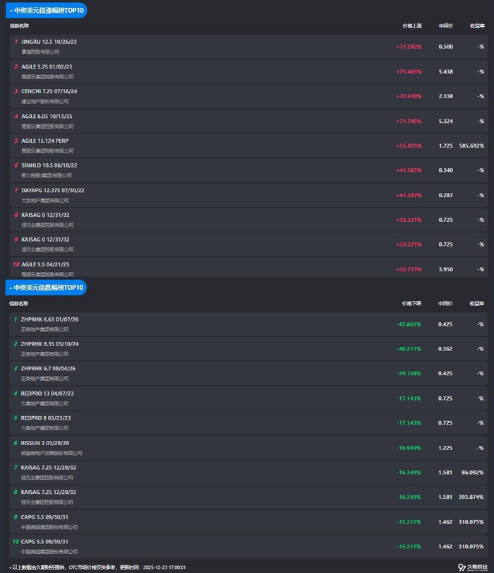 12月23日,中资美元债涨跌幅榜TOP10如下: