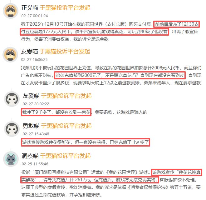 2月黑猫投诉游戏领域红黑榜:我的花园世界虚假宣传,充值上万不送真花