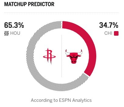 今天ESPN给出了本场比赛的胜率预测,火箭为65.3%,公牛为34.7%。