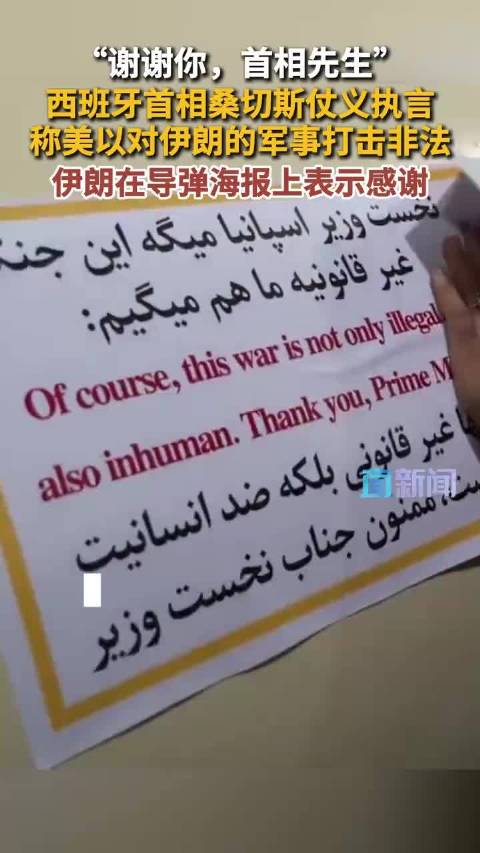 [“谢谢你,首相先生”西班牙首相桑切斯仗义执言 称美以对伊朗的军事打击非法 伊朗在导弹海报上表示感谢]当地时间3月23日凌晨,伊朗伊斯兰革命卫队发表声明称,伊朗当天发动了“真实承诺-4”第75轮军事行动。伊朗在向以色列发射导弹前贴上了“谢谢西班牙首相”海报:这场战争不仅非法,而且不人道。谢谢你,首相先生。西班牙首相桑切斯3月19日在出席欧盟峰会期间表示,美以对伊朗的军事打击是非法的,西班牙政府对此予以谴责并坚决反对。